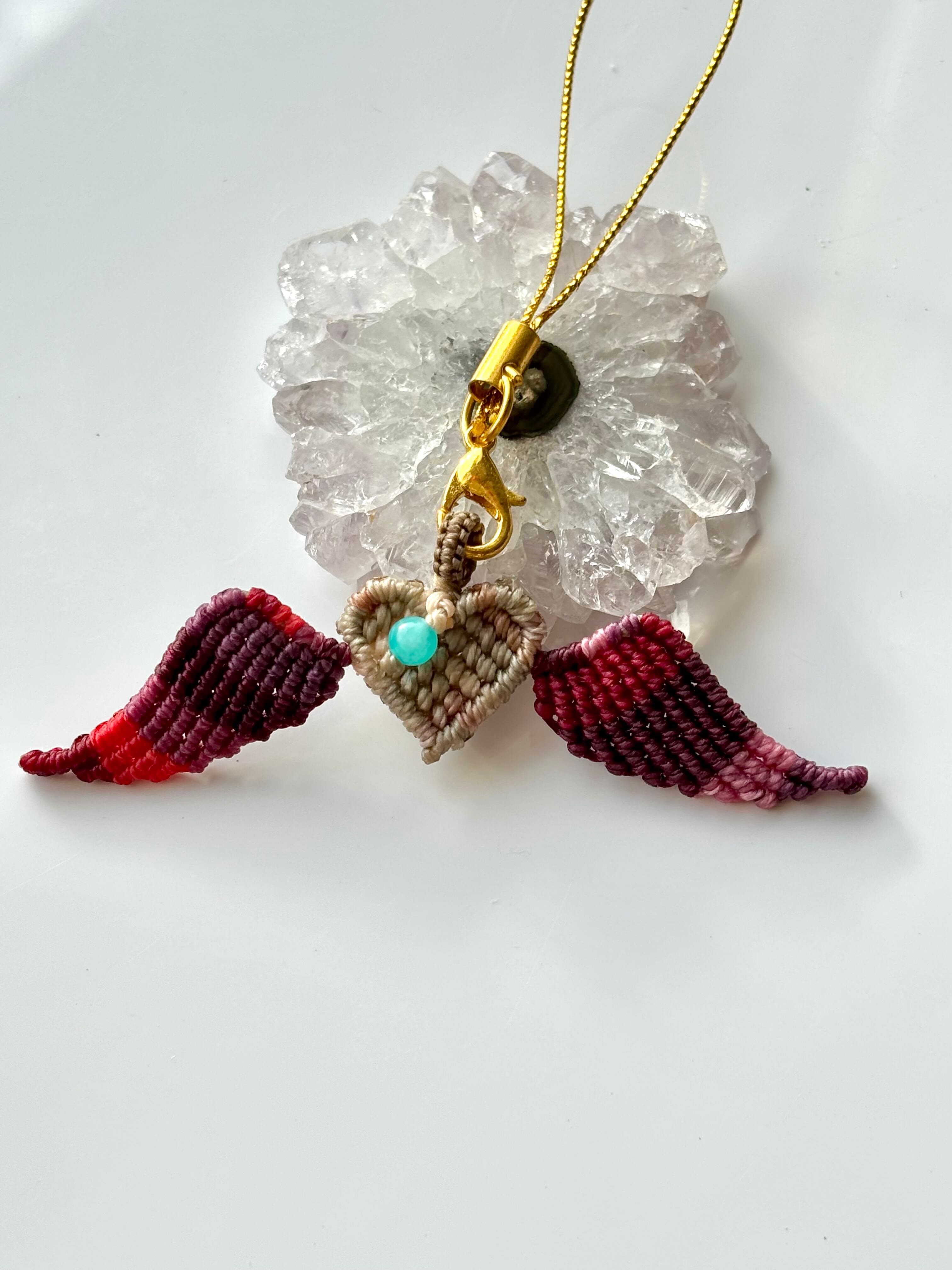 ハートに羽根をまとった、幸せを運ぶモチーフ。カラフルなマクラメで編み上げた姿は、眺めるだけで心が軽やかになります。バッグチャームやインテリアとしても映える、愛らしさとおしゃれさを兼ね備えたアイテムです。