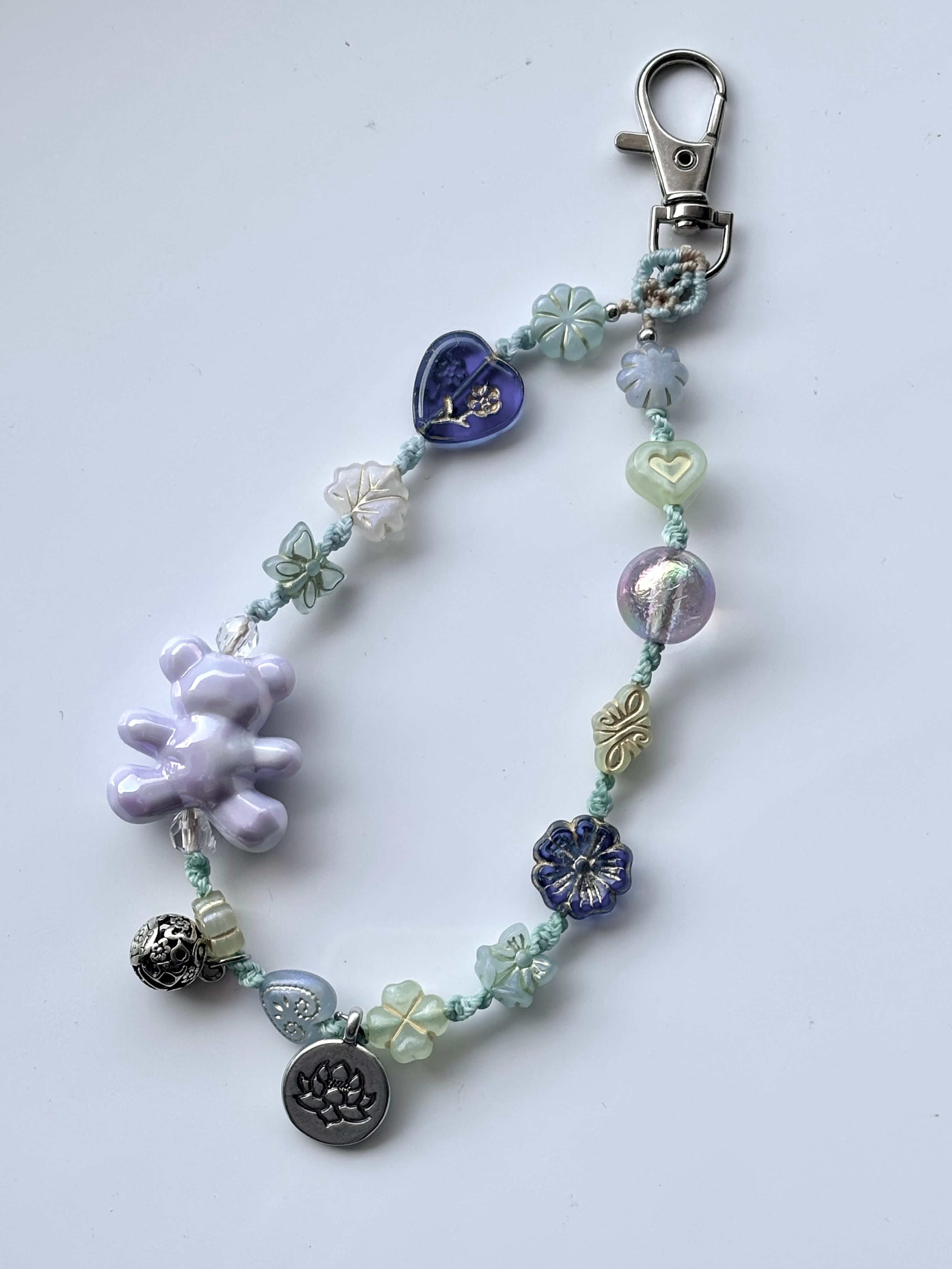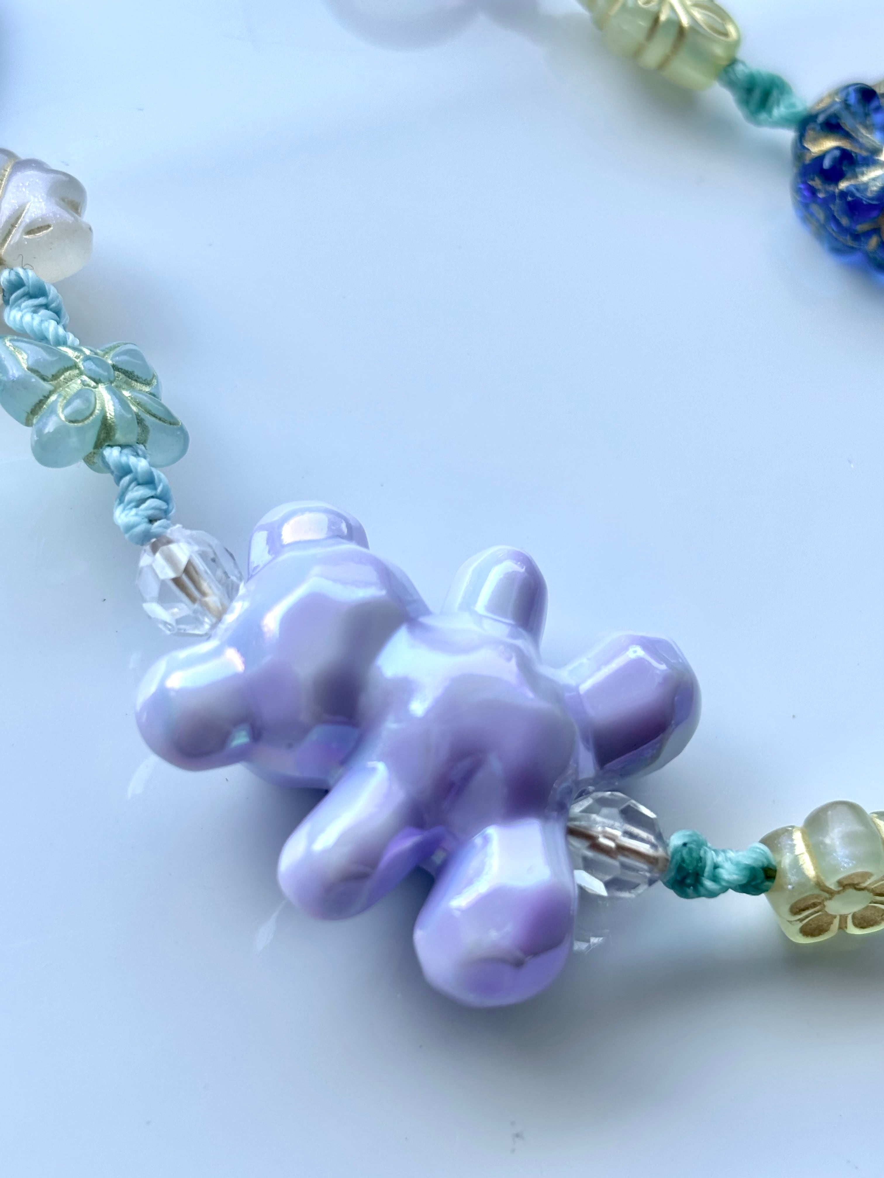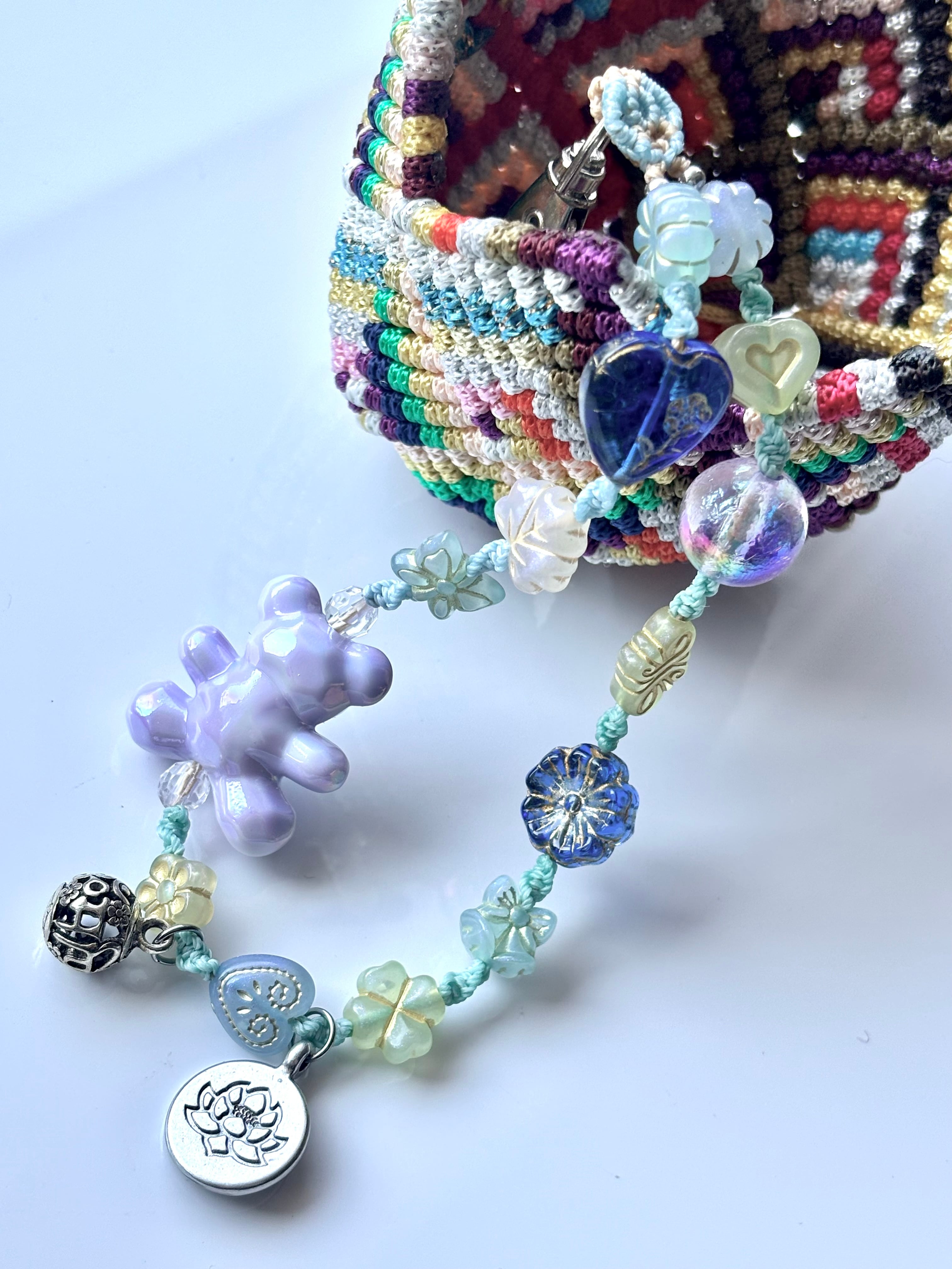 ブルーやパープルのビーズをマクラメで楽しく結び、ちょこんと紫のテディベアを添えました。