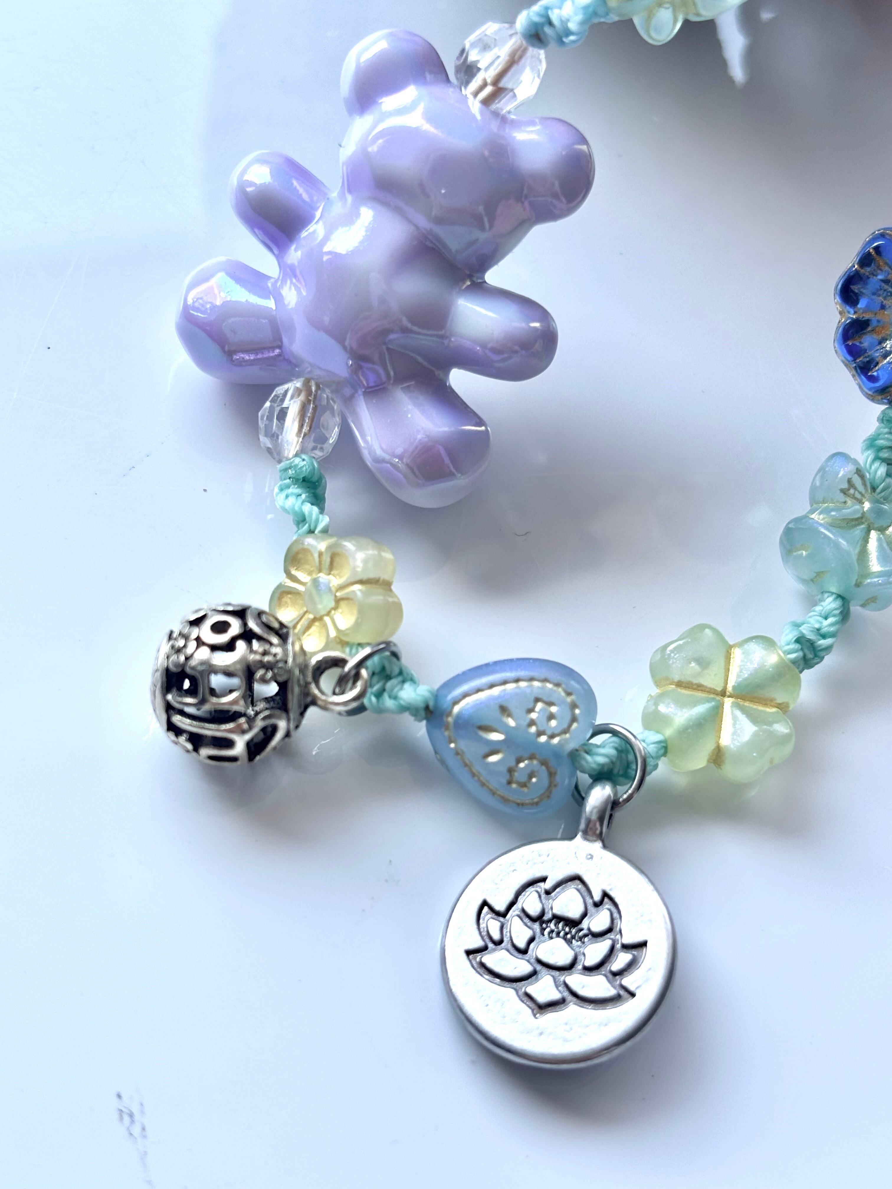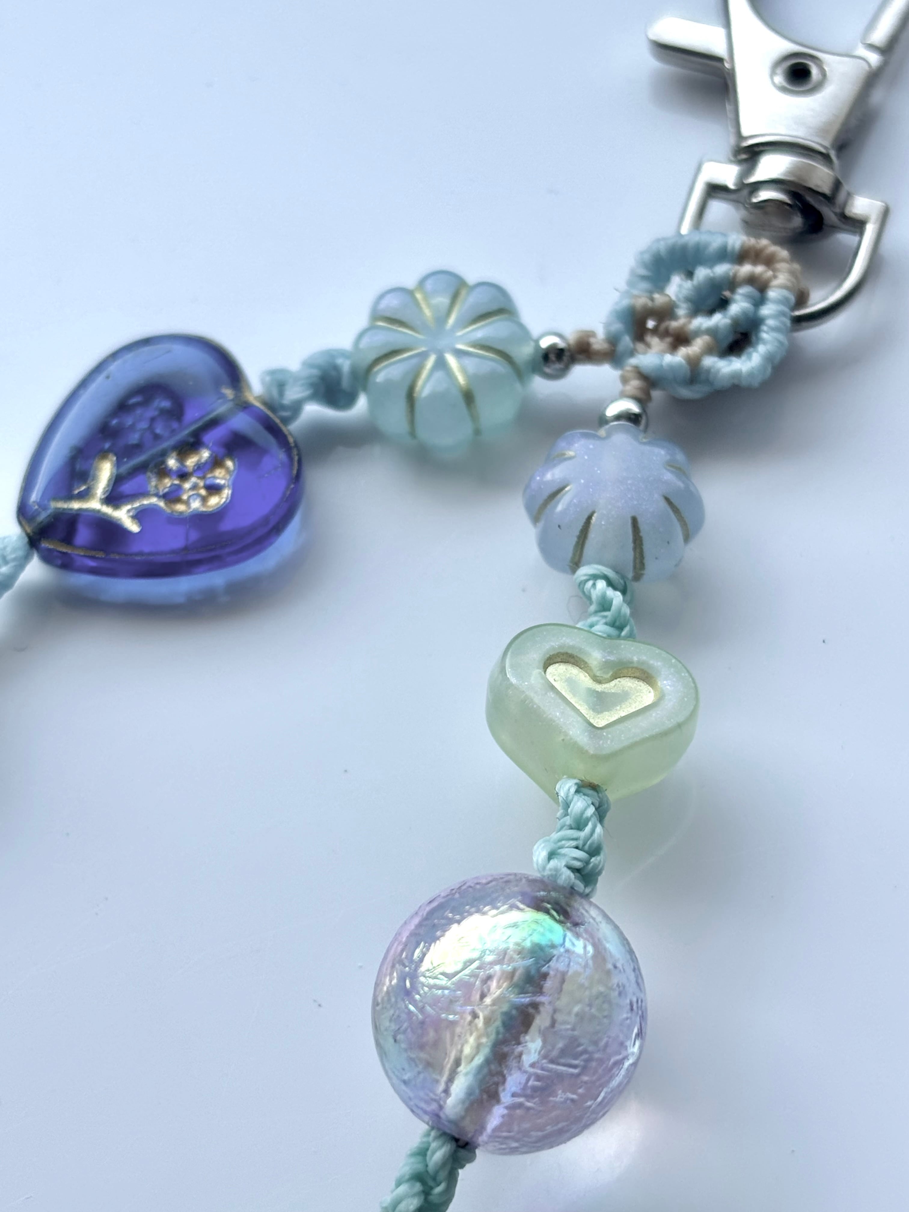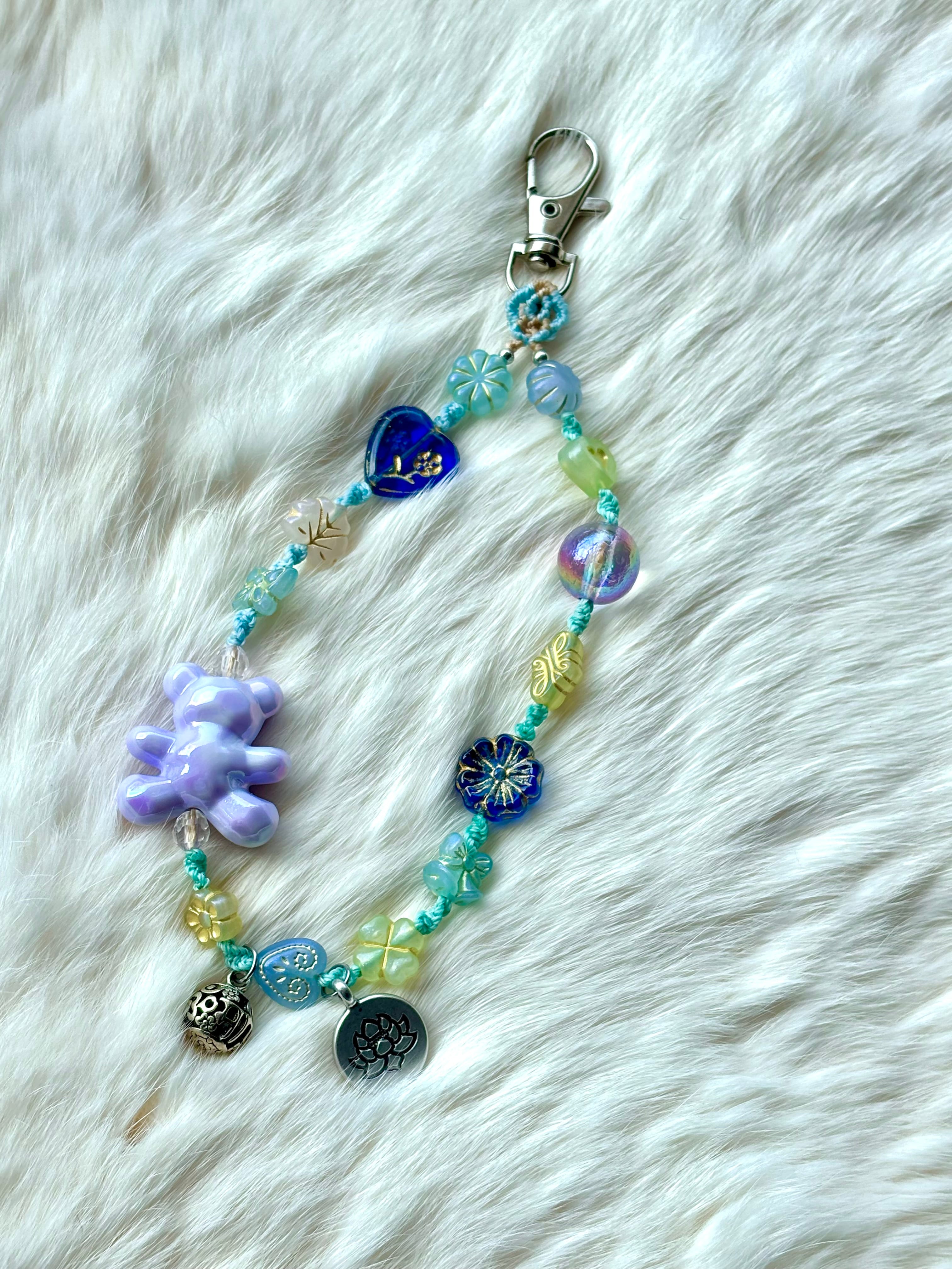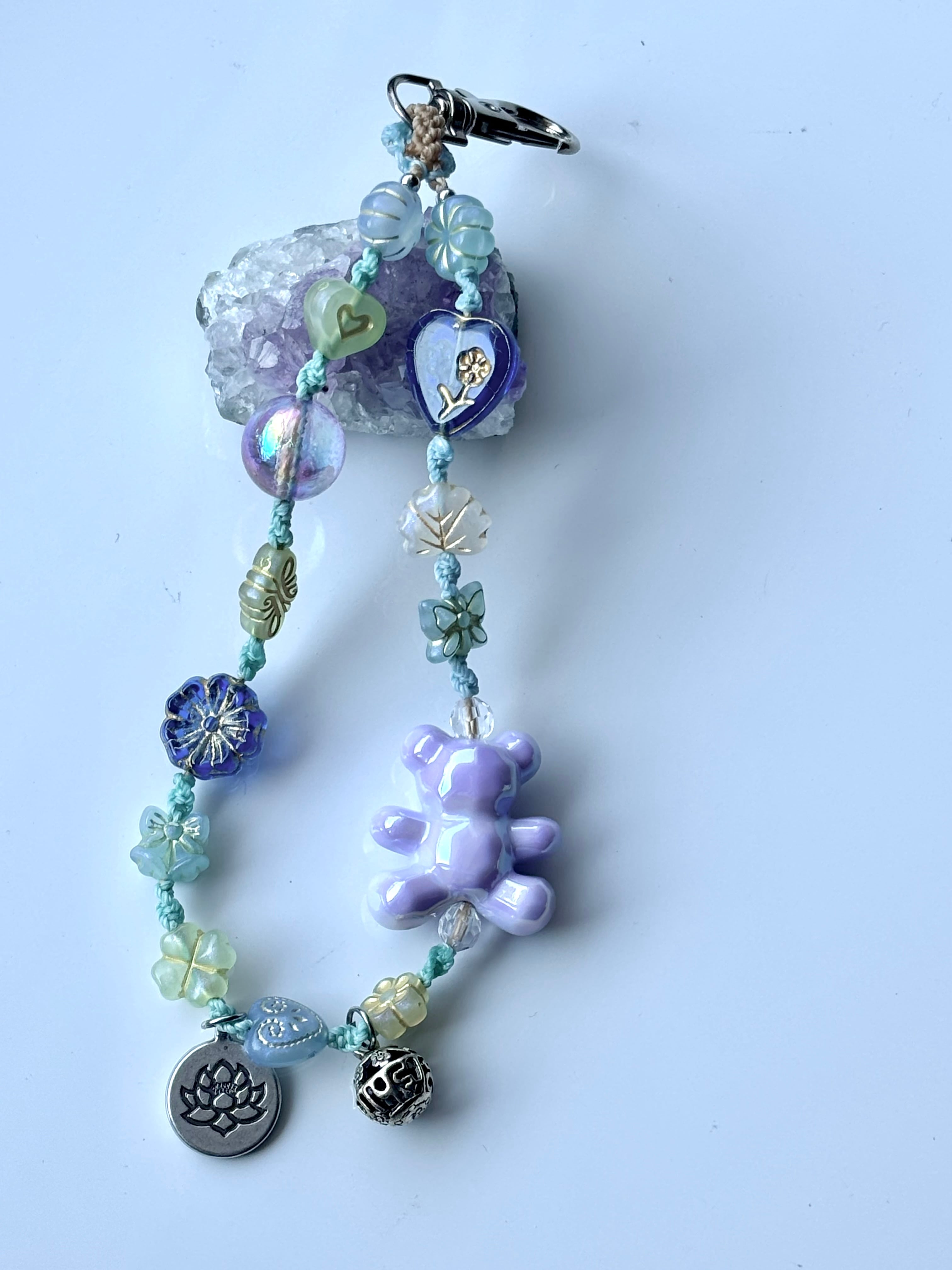 ブルーやパープルのビーズをマクラメで楽しく結び、ちょこんと紫のテディベアを添えました。