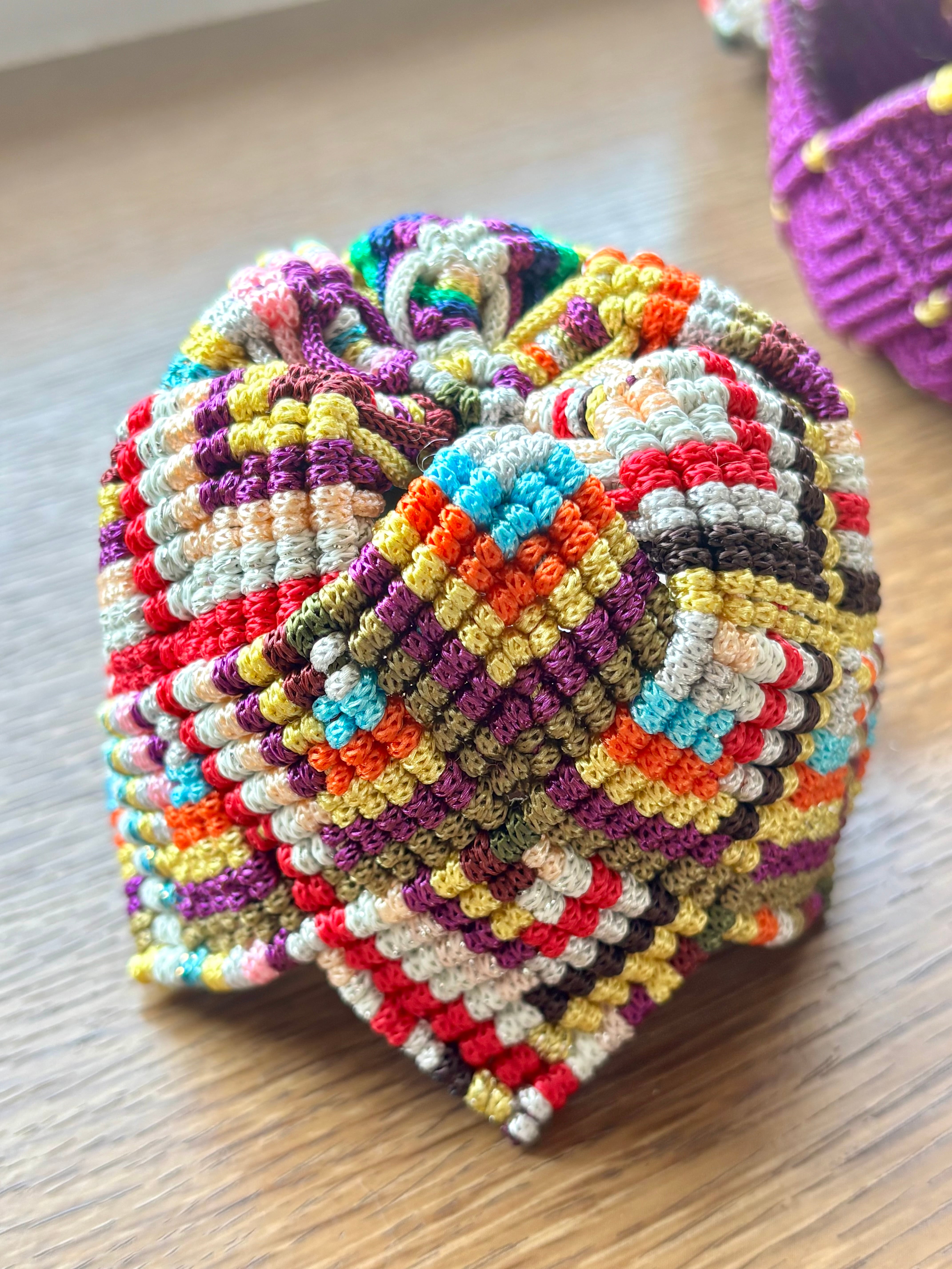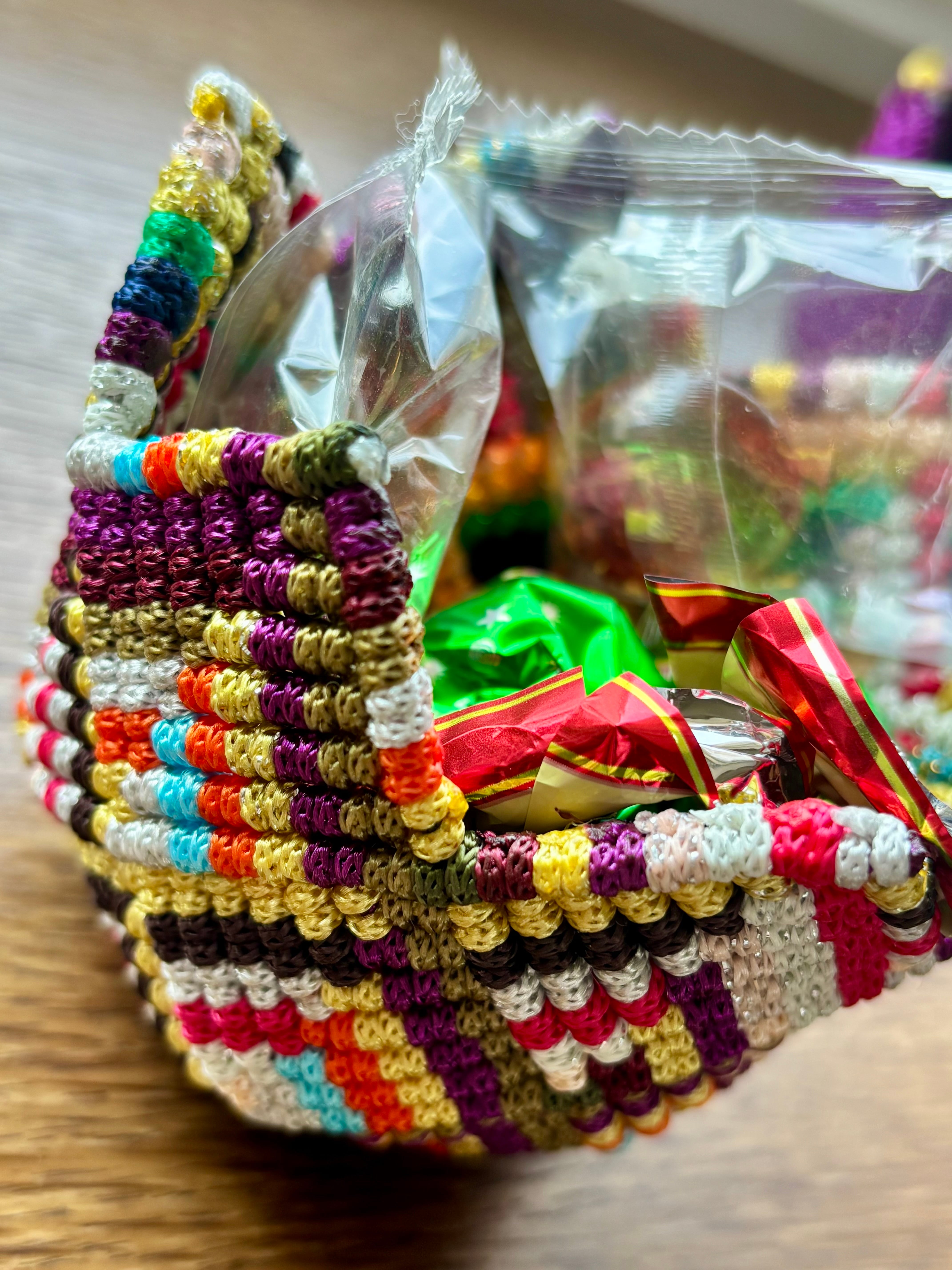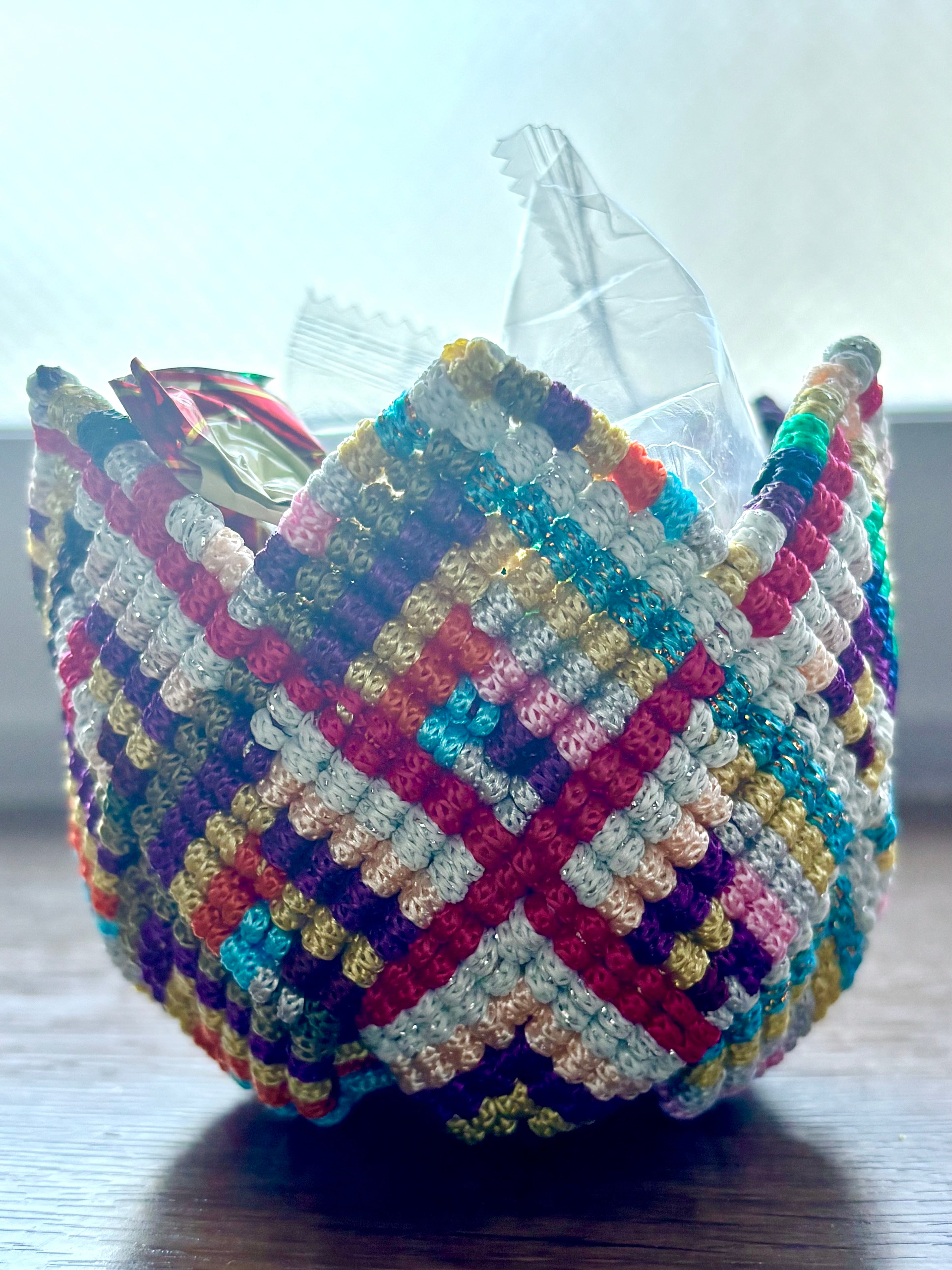 色とりどりの糸が巡り、ひとつの形へと結ばれていく小さな籠。