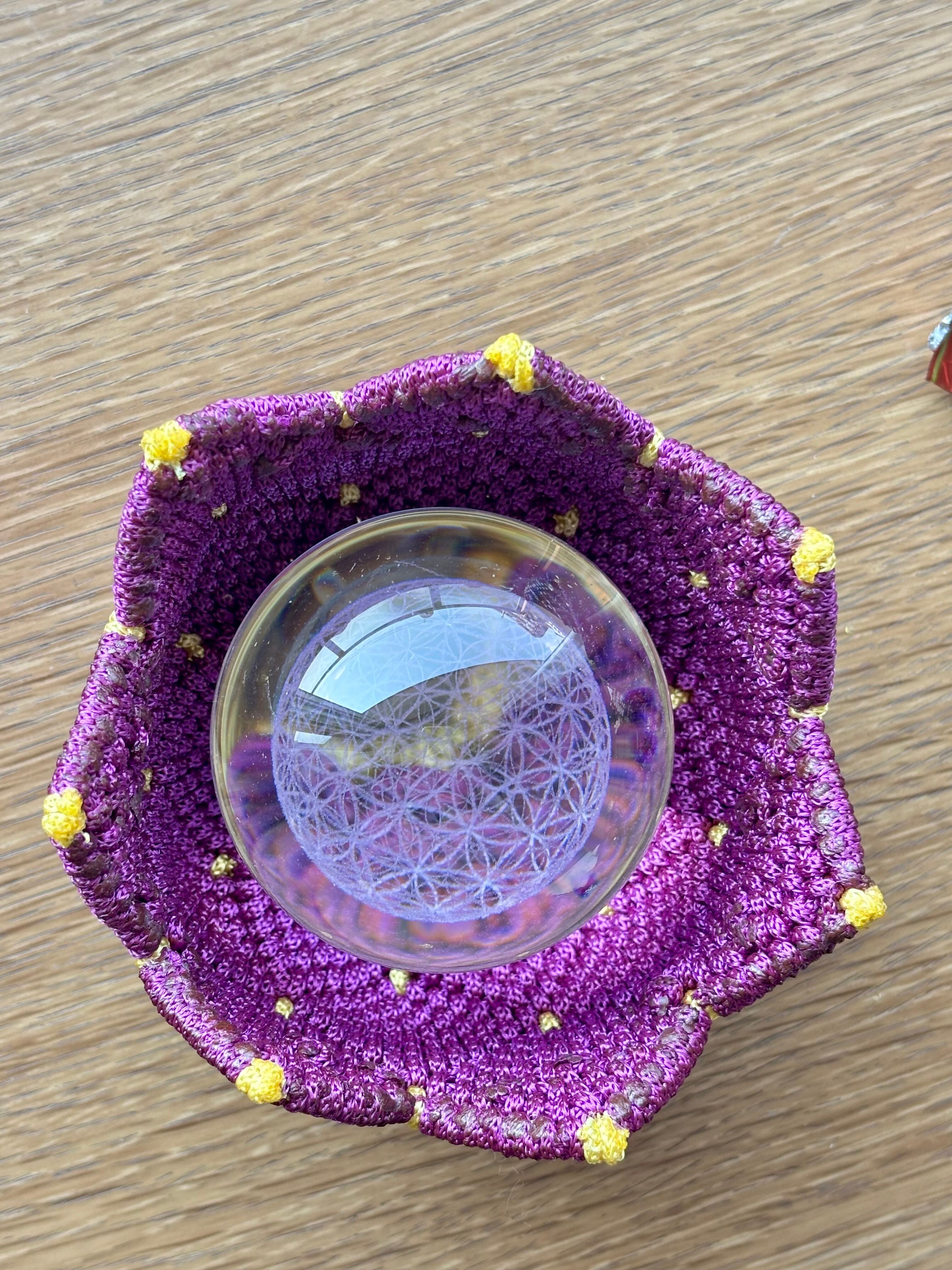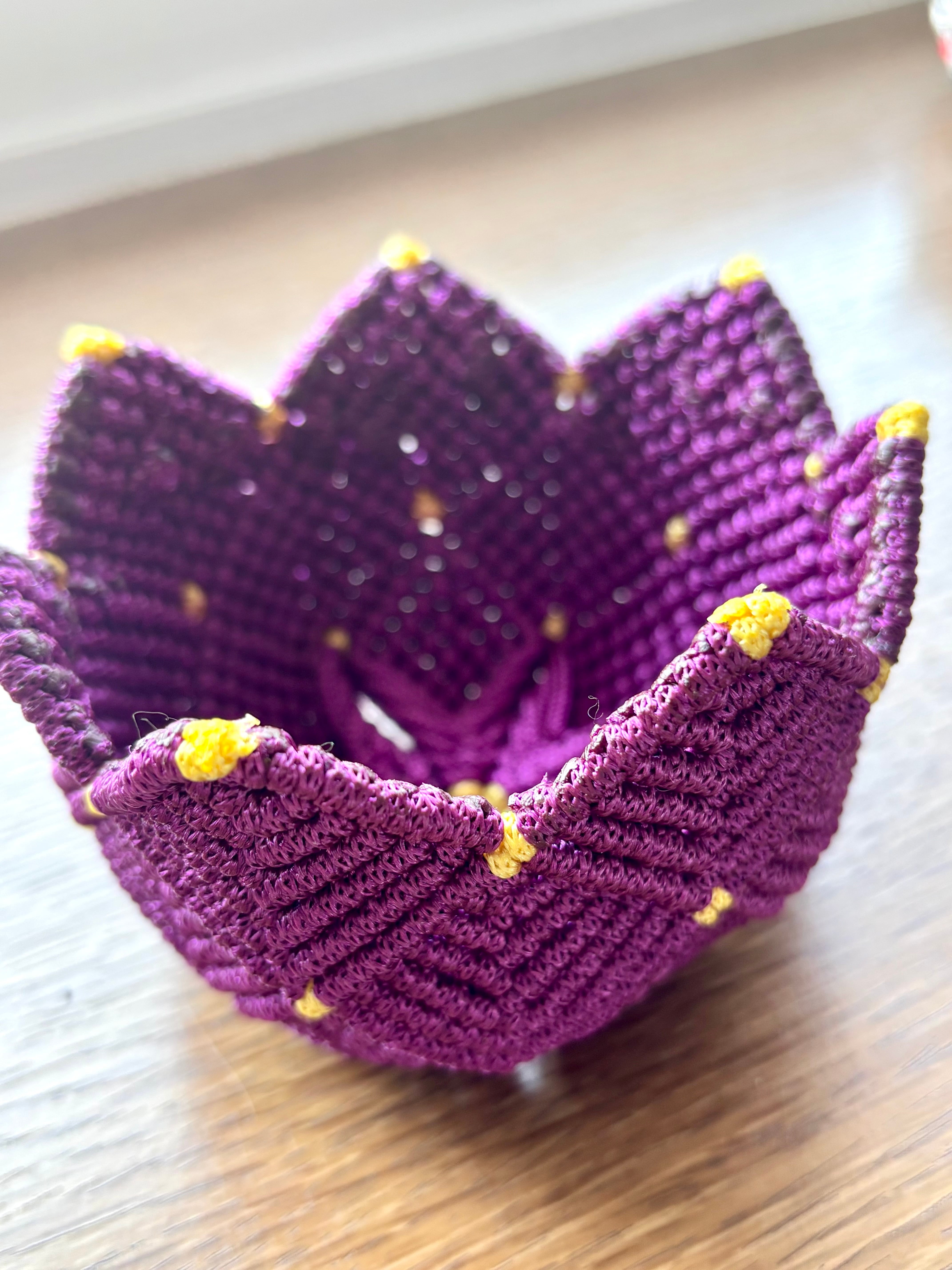 深い紫の糸で一目ずつ丁寧に編み上げ、