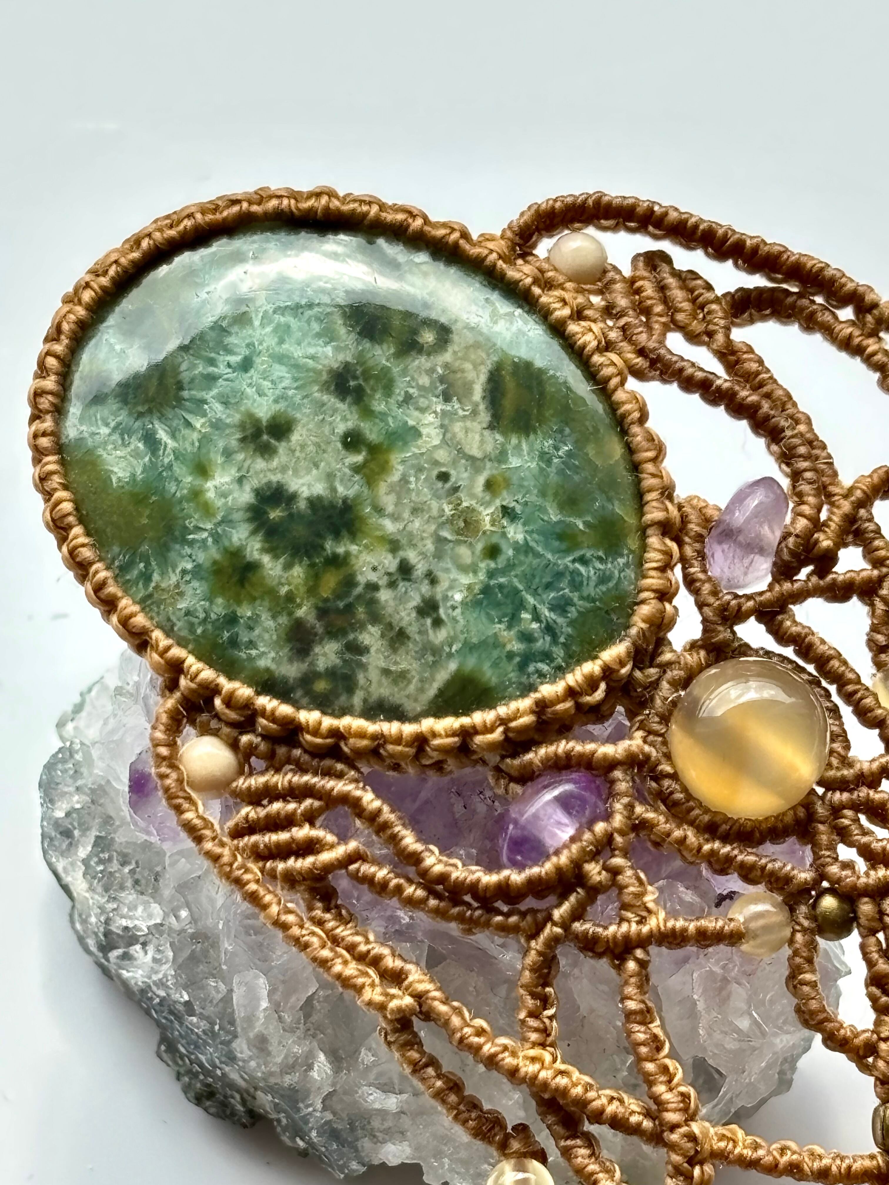 オーシャンジャスパー、カーネリアン、アメシストなど挟みながら丹念に編み上げた大ぶりペンダント。