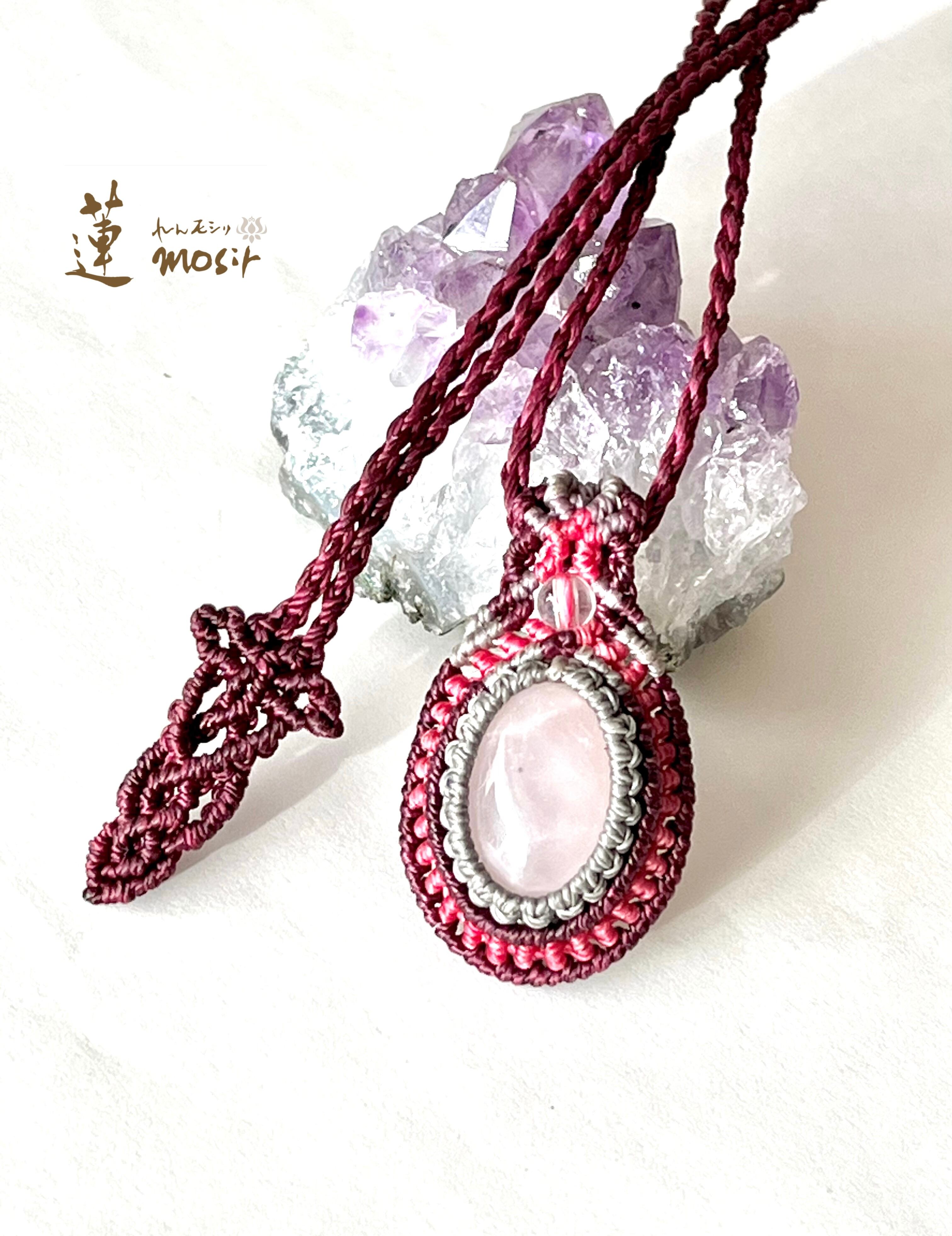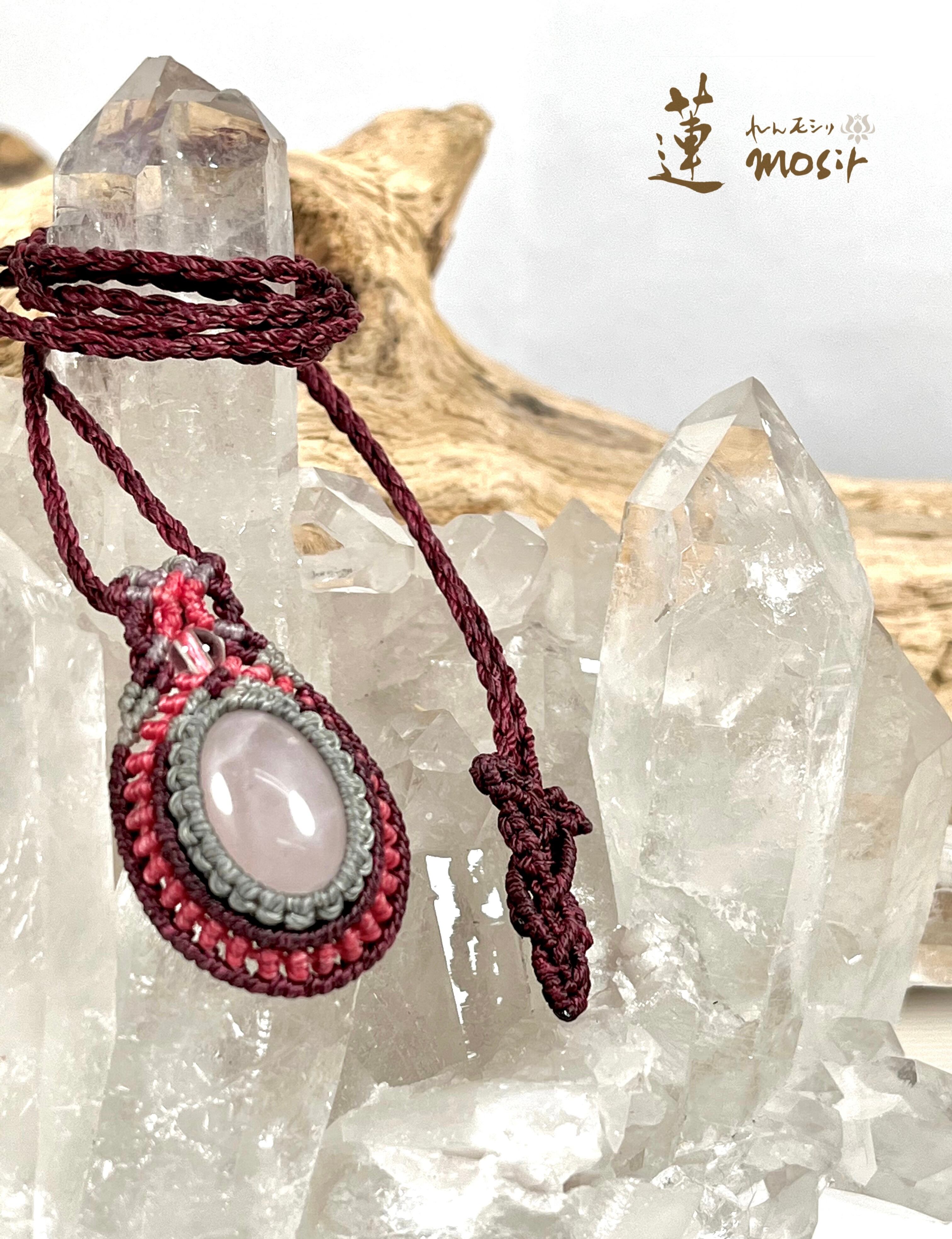 やわらかな光をたたえるローズクォーツは、心にそっと寄り添う愛の石。繊細な編み模様が朝露のように石を包み込み、胸元で静かに輝きます。日常に優しさと癒しを添える、ふんわりとした存在感。