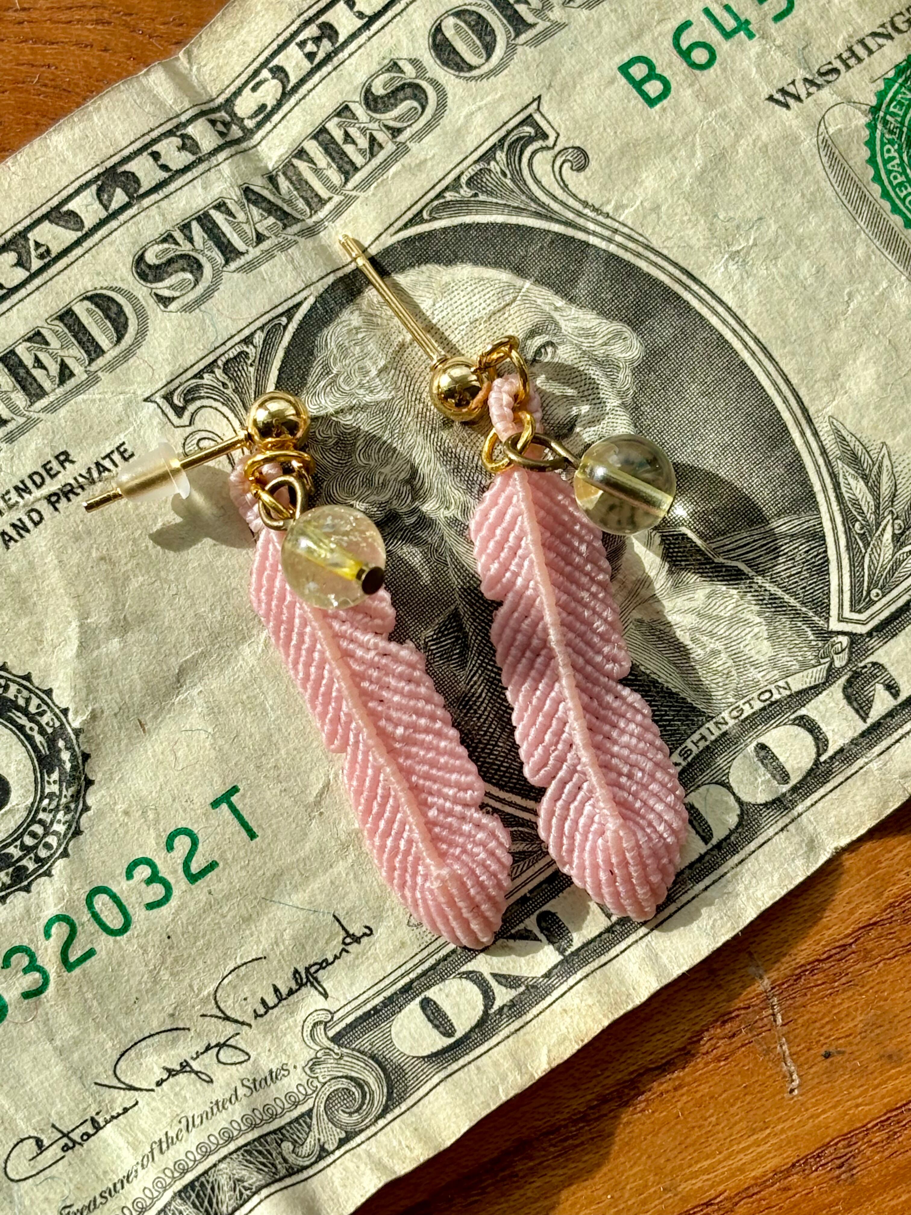 優しいピンクに灯る光の粒。黄昏時のあたたかな光のように、そっと寄り添う羽根のアクセサリー。