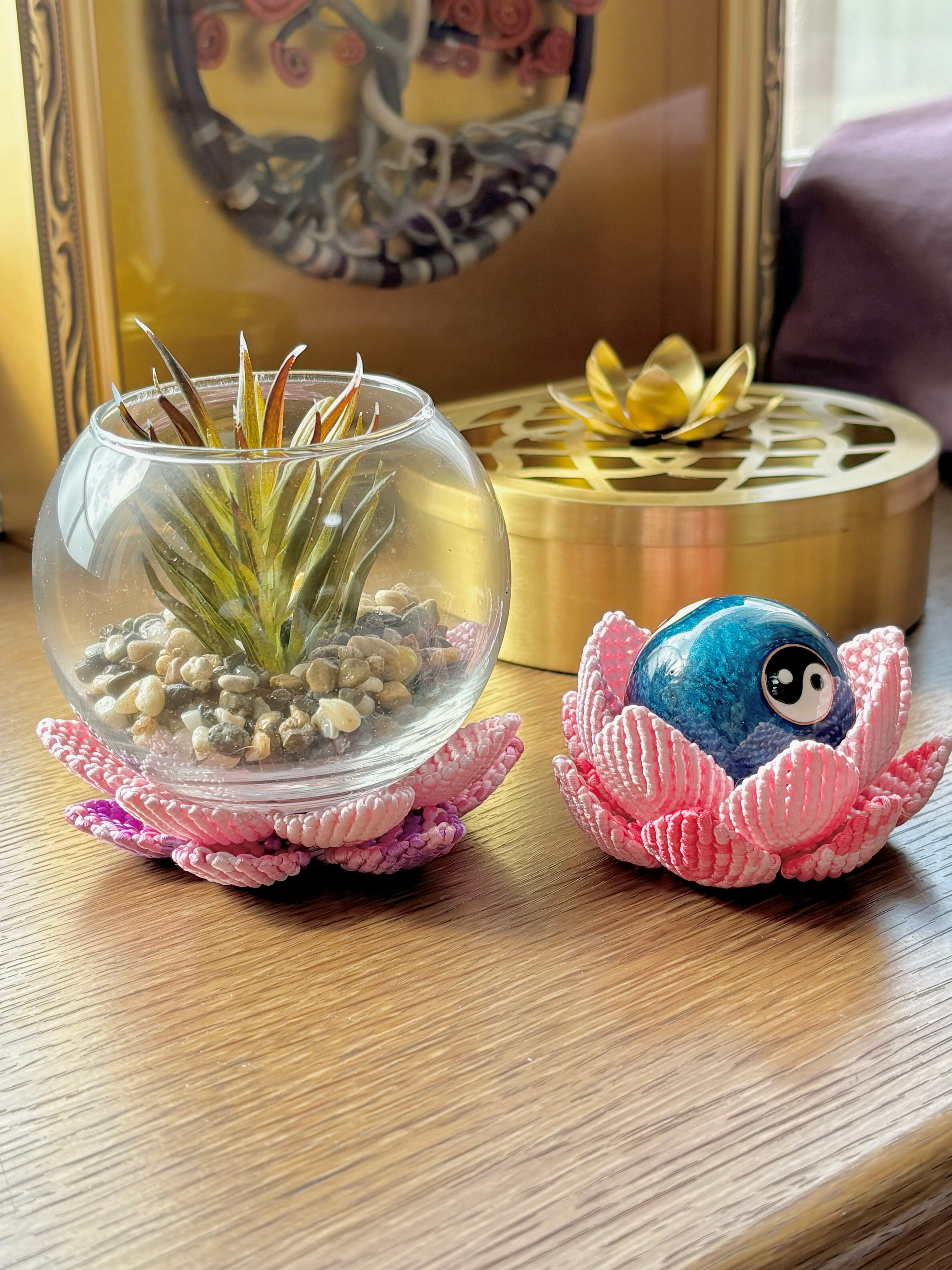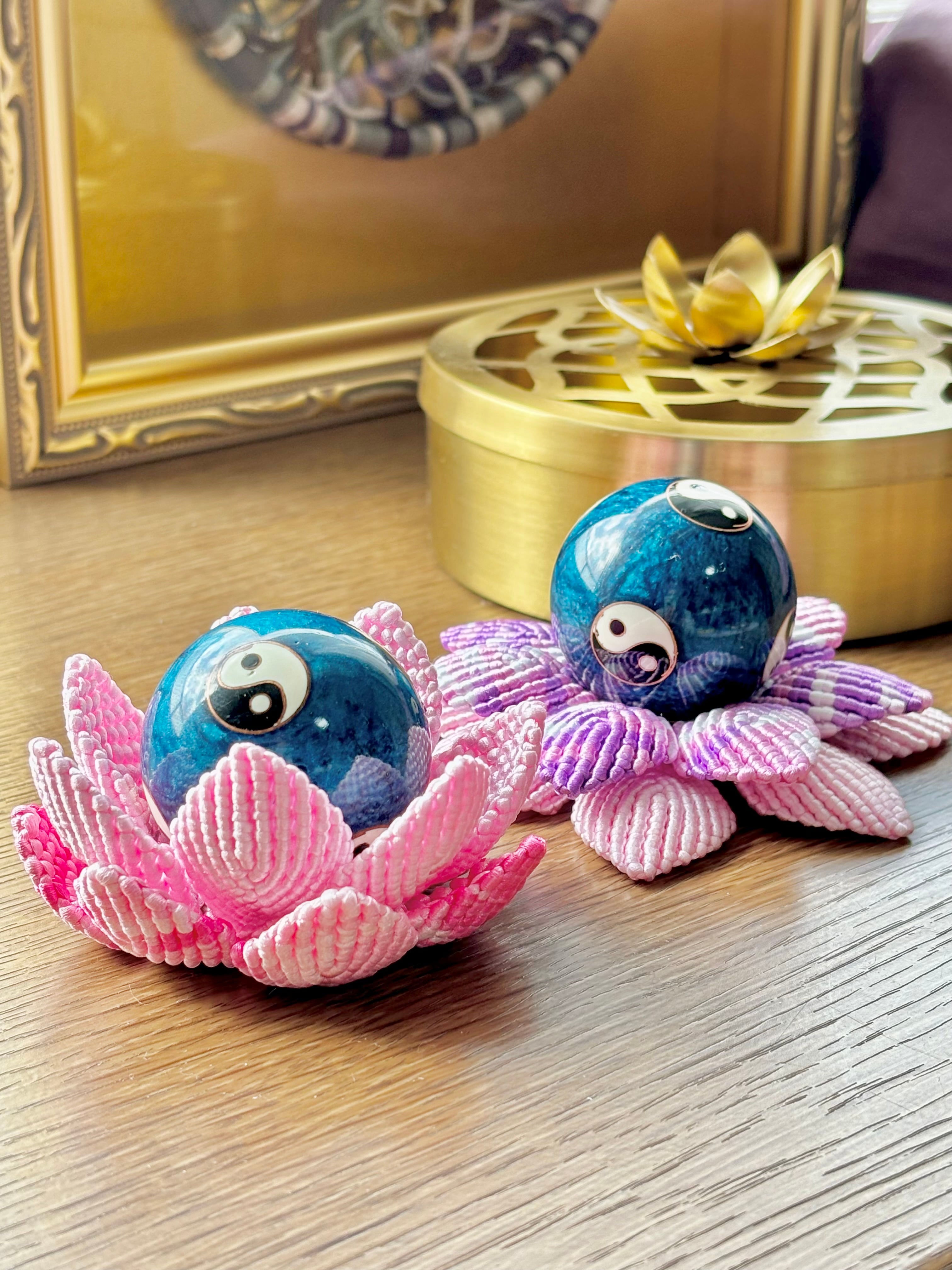 外側の小さい花びらが濃いピンクの入る段染め、パープルの色が入る段染めを使った2種類ご用意しました。