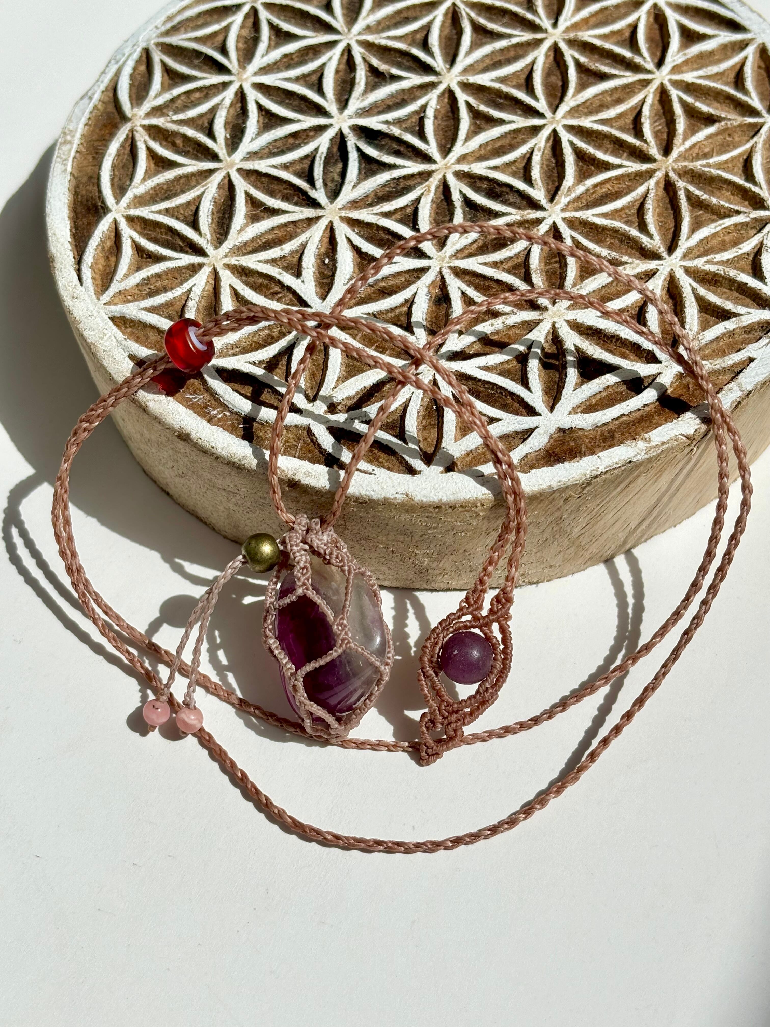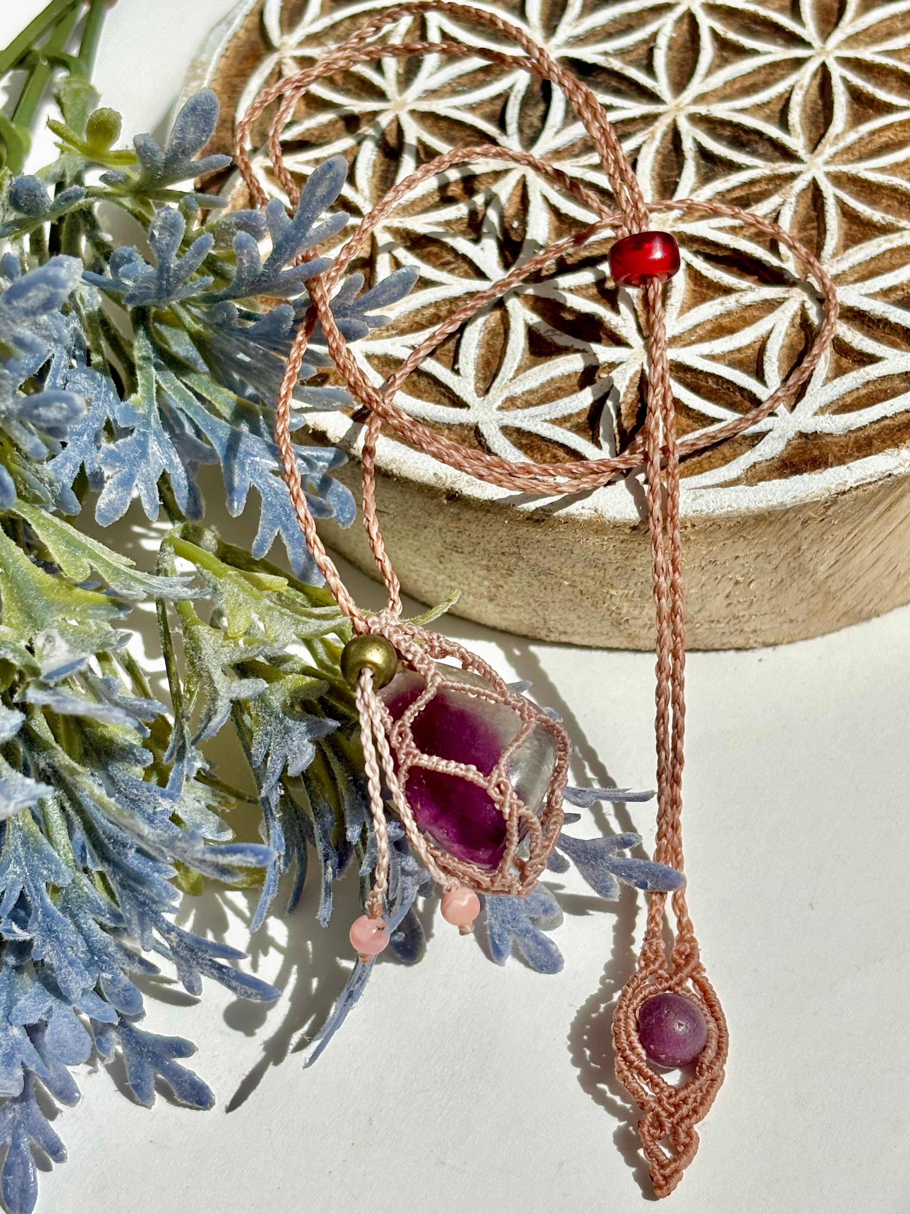 フローライトを優しく包み込む、巾着型のマクラメペンダント《Sacchetto》。