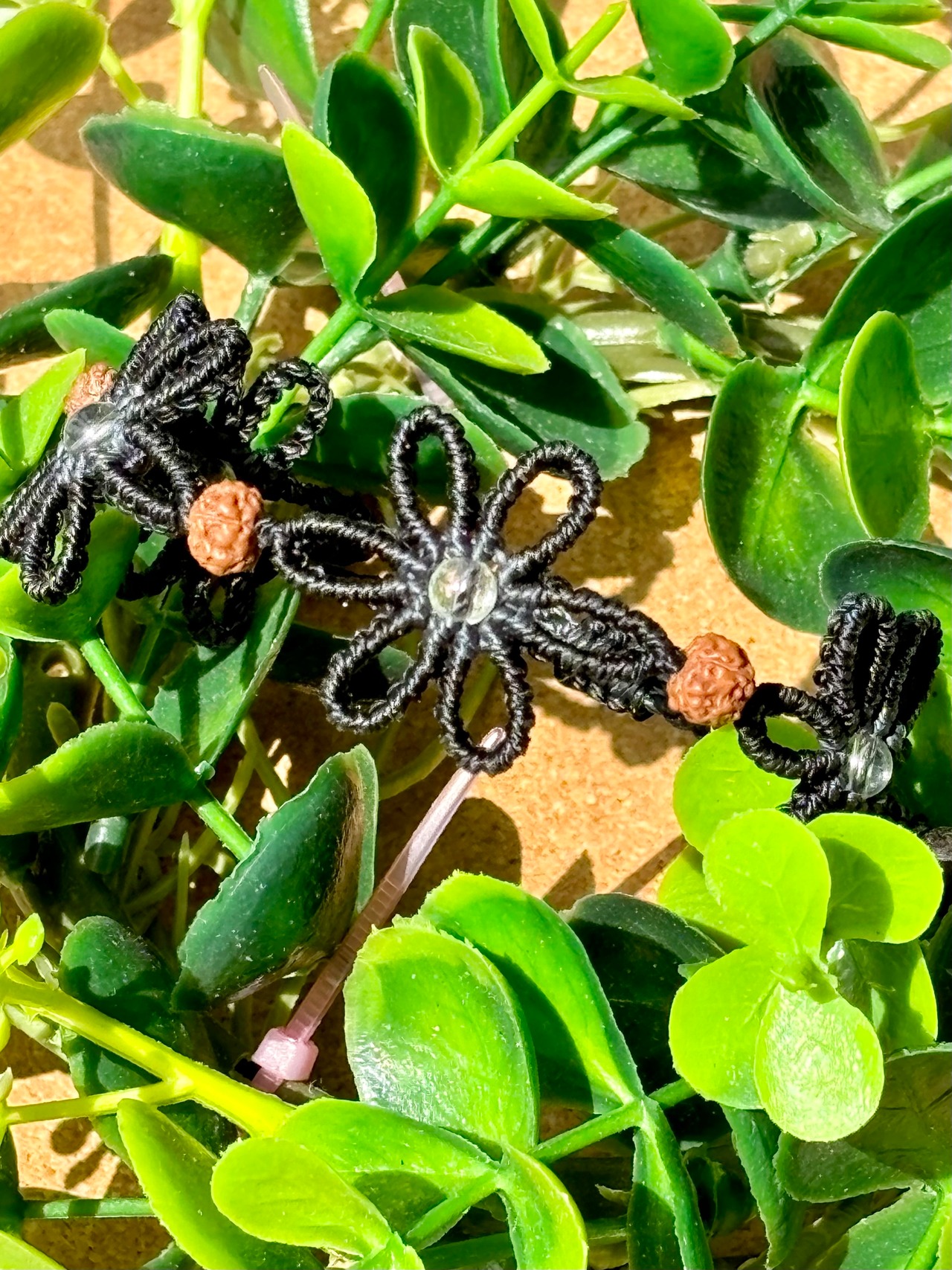 水晶の透明感とルドラクシャのぬくもりが織りなす花の連なり。